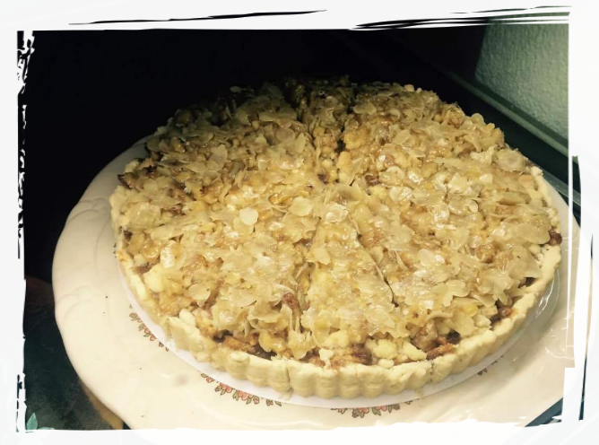 Eine vierschichtige Tarte: Süsssäuerliche ApfelZimtfüllung auf einem Mürbeteigboden, bedeckt mit Streuseln, welche wiederum eine Schicht karamellisierte Nüsse bedecken.