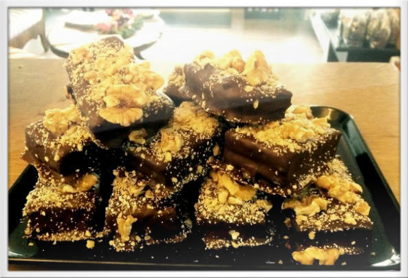 Saftiger Brownieteig mit Walnussstückchen & Schokoüberzug.